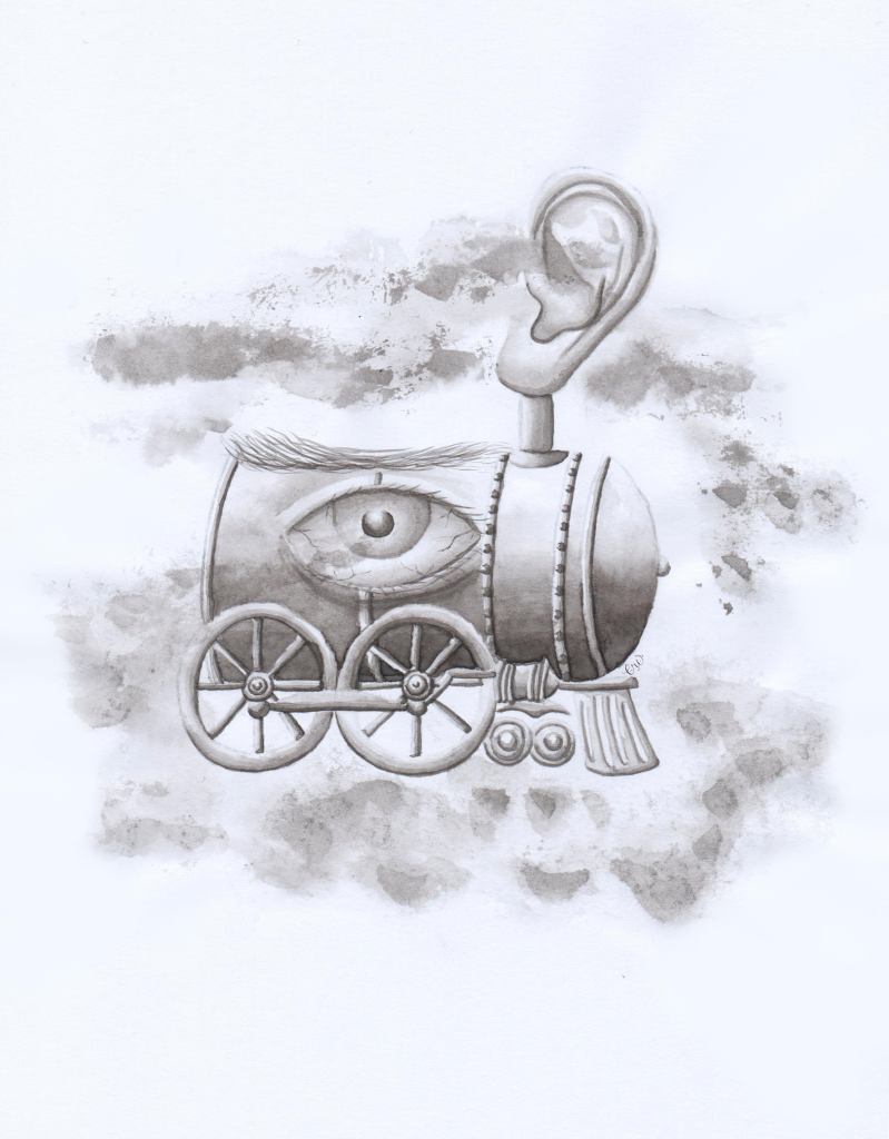 ¿Por qué es todo tan lúgubre?, se preguntó al recordar, de pronto, que no había visto ningún otro pasajero. Ni en el vagón, ni en el andén, antes de abordar. Sólo había escuchado unas voces apagadas que parecían venir de muy lejos, tal vez de otro mundo. Esos hilos de voz se habían transformado súbitamente en risitas casi nerviosas. Hilda se inquietaba cada vez más. No estaba segura si realmente existían esas voces o sólo parloteaban en su mente. Un pánico absurdo, como un ente amenazante e irracional, le asediaba. Respiraba con dificultad. En su mente se estacionó una espesa neblina que ya no la dejaba razonar. Hizo unos débiles intentos para pedir auxilio, pero su lengua yacía seca en la cavidad de su boca y no lograba emitir sonido alguno. ¿Quién la oiría así?