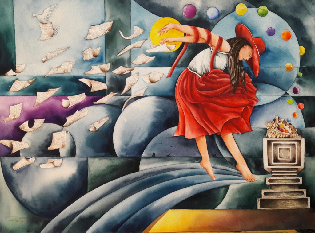 Se secarán los cántaros/ que atesoran la lluvia./ Estallarán en lágrimas las plumas de las aves./ No quedarán las islas/ ni los borrosos límites./ Los peces morirán en todas las orillas, […] El tiempo será solo/un doloroso indicio,/ pero no habrá dolor ni menos quien presienta./ Como un iris vacío/ se mirará el vacío/ en el vidrio impalpable de los días impalpables.[10]